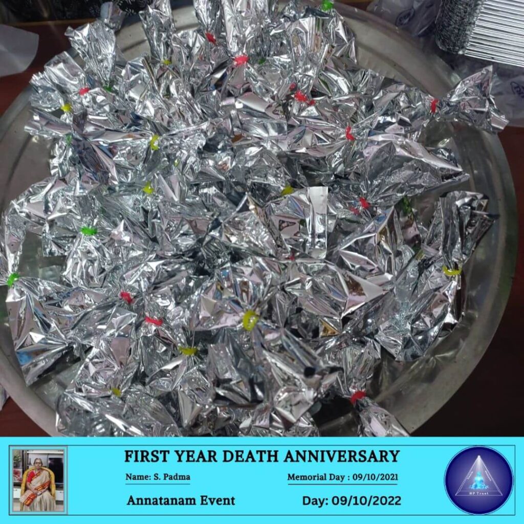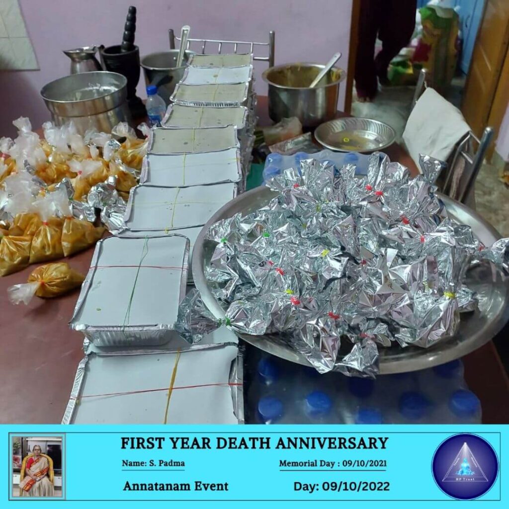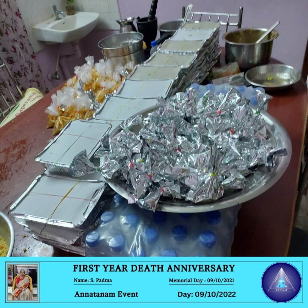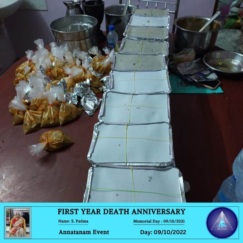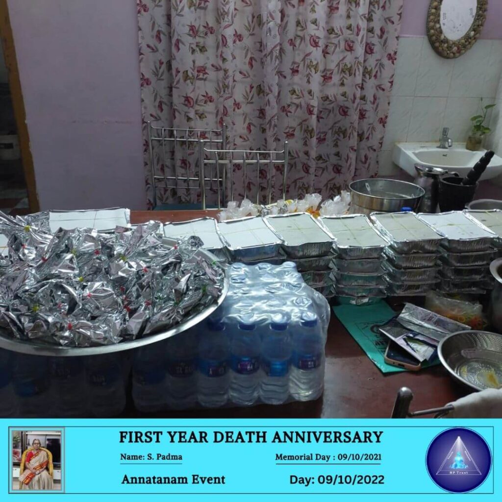 ANNATANAM EVENT FOR FIRST YEAR DEATH ANNIVERSARY OF S. PADMA ON 09.10.2022 October 13, 2022 | No Comments ANNATANAM EVENT FOR FIRST YEAR DEATH ANNIVERSARY OF S. PADMA ON 09.10.2022